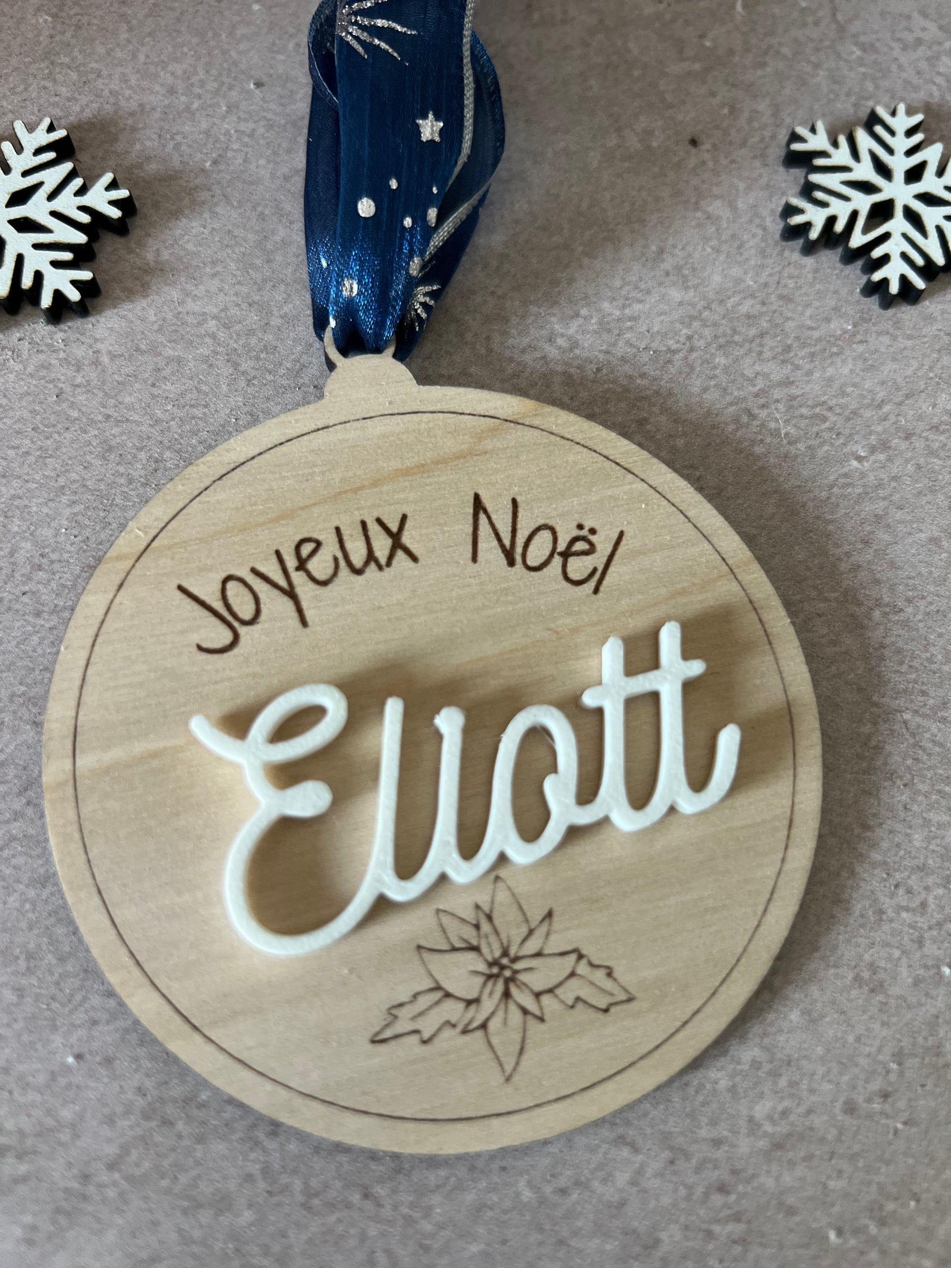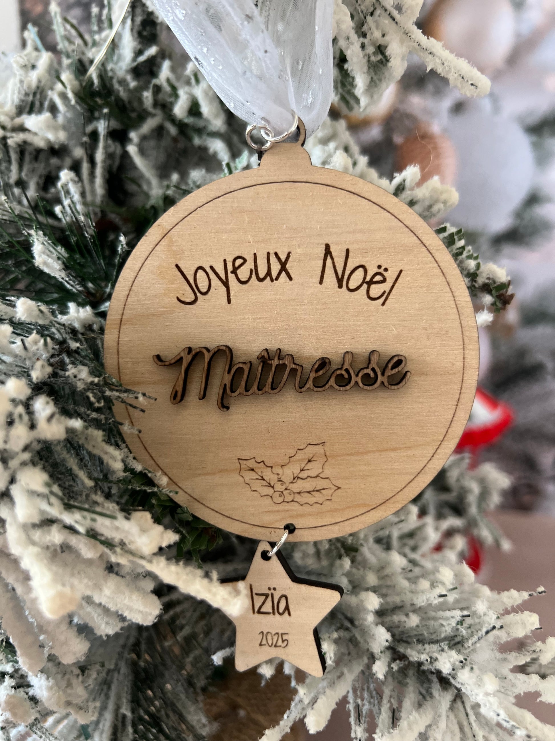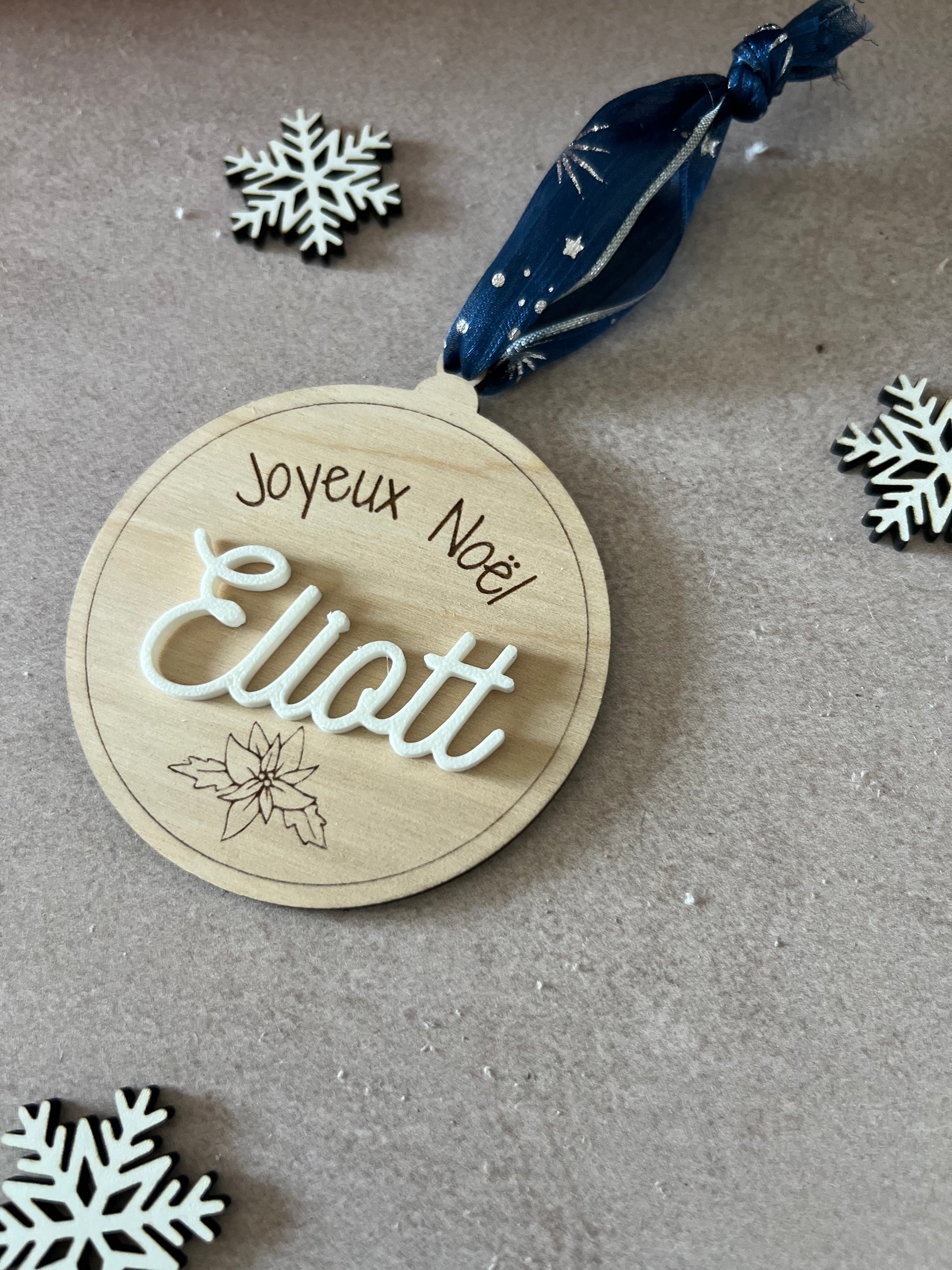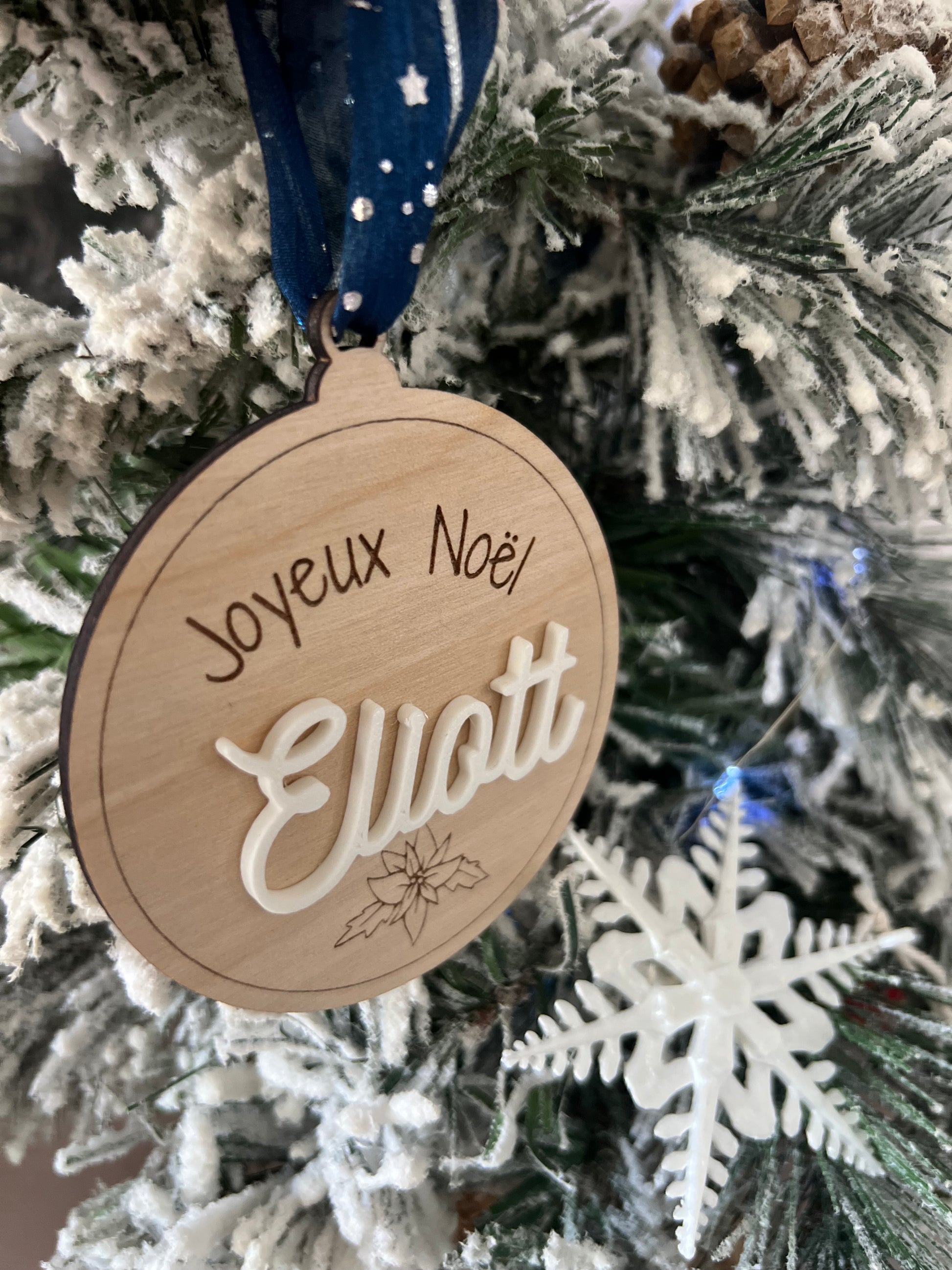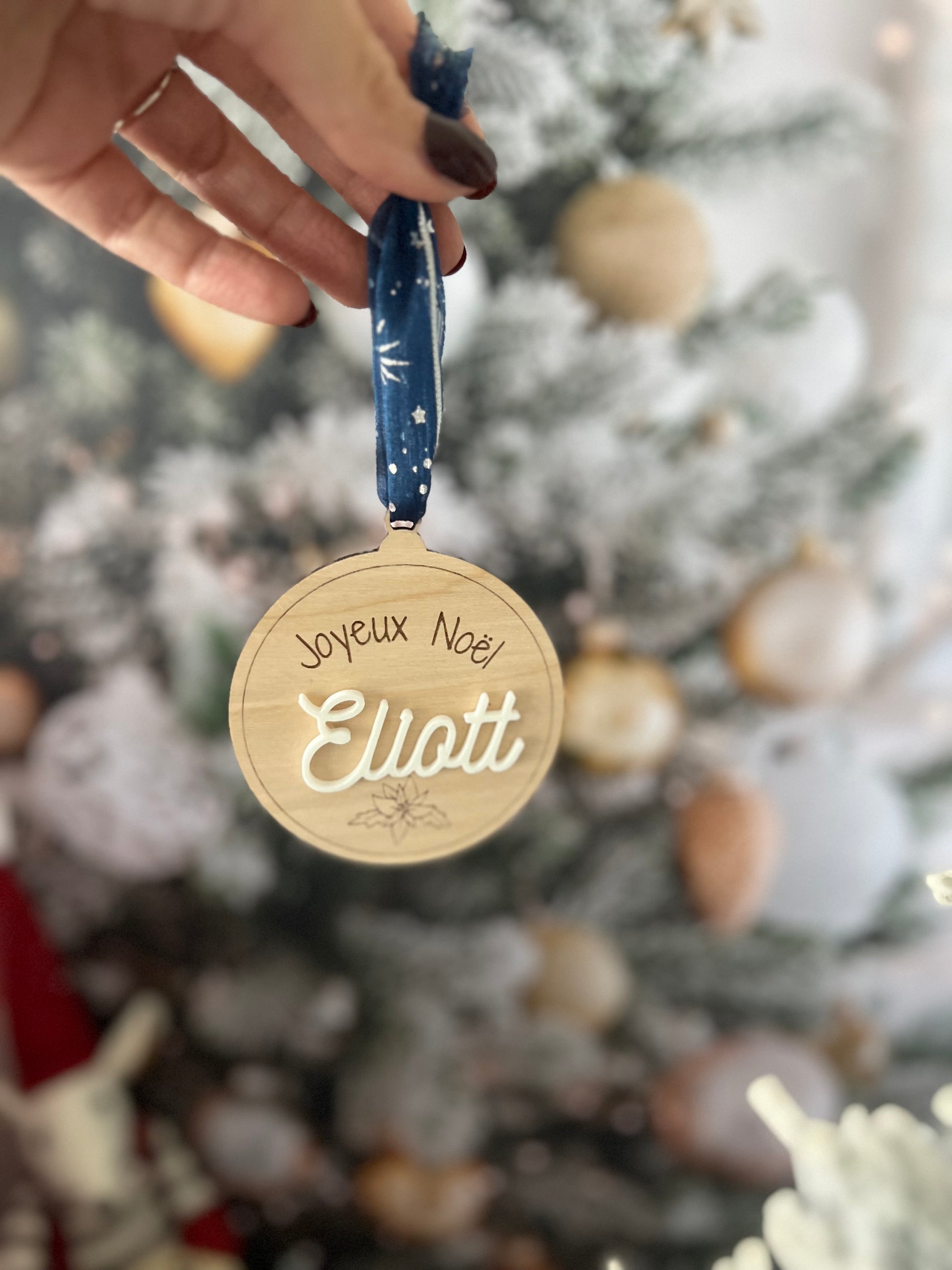 Chaque boule est découpée et gravée avec soin dans du bois de bouleau clair, puis personnalisée avec le prénom de votre choix en couleur pour accompagner vos cadeaux de manière élégante et écoresponsable.