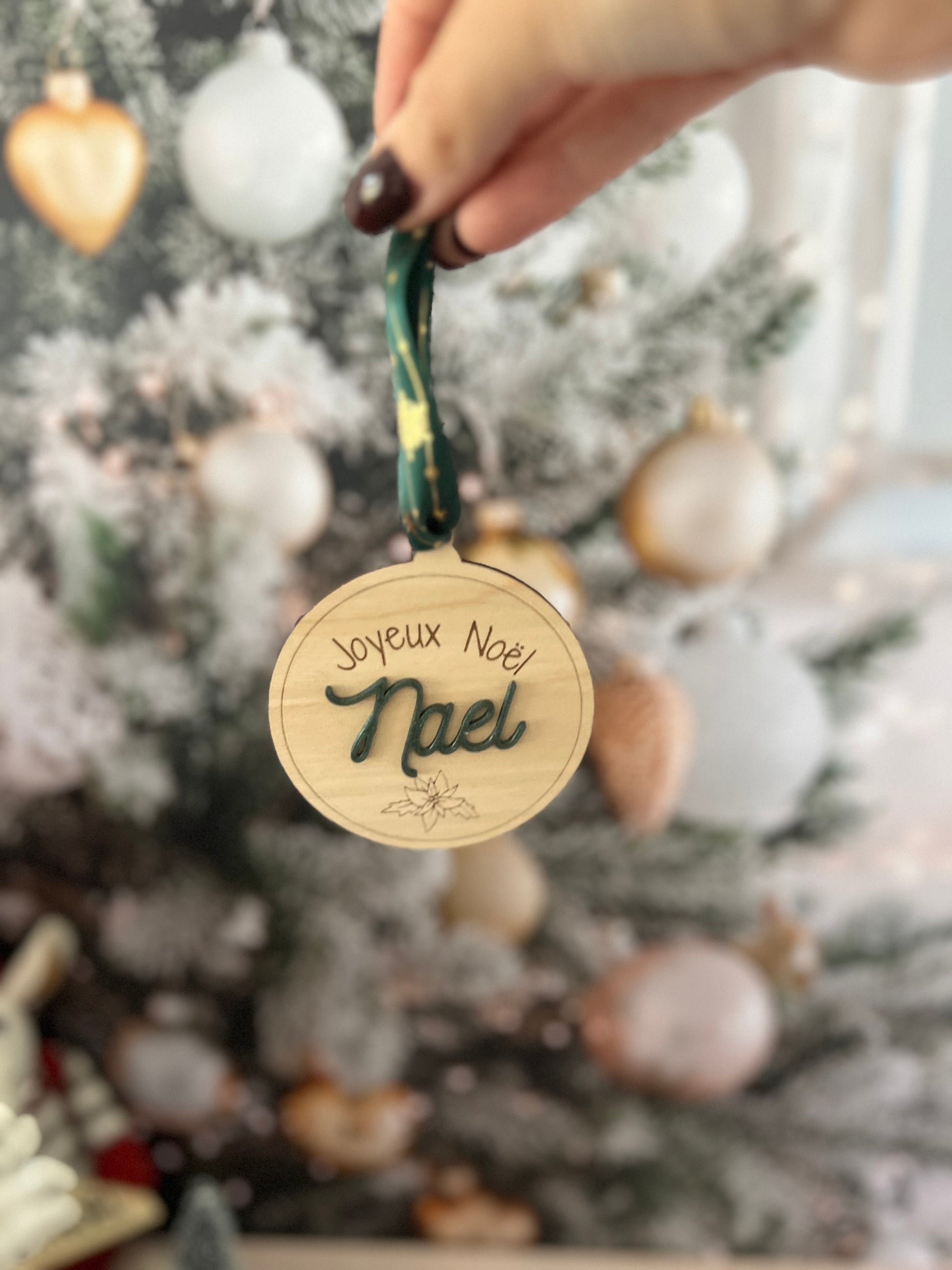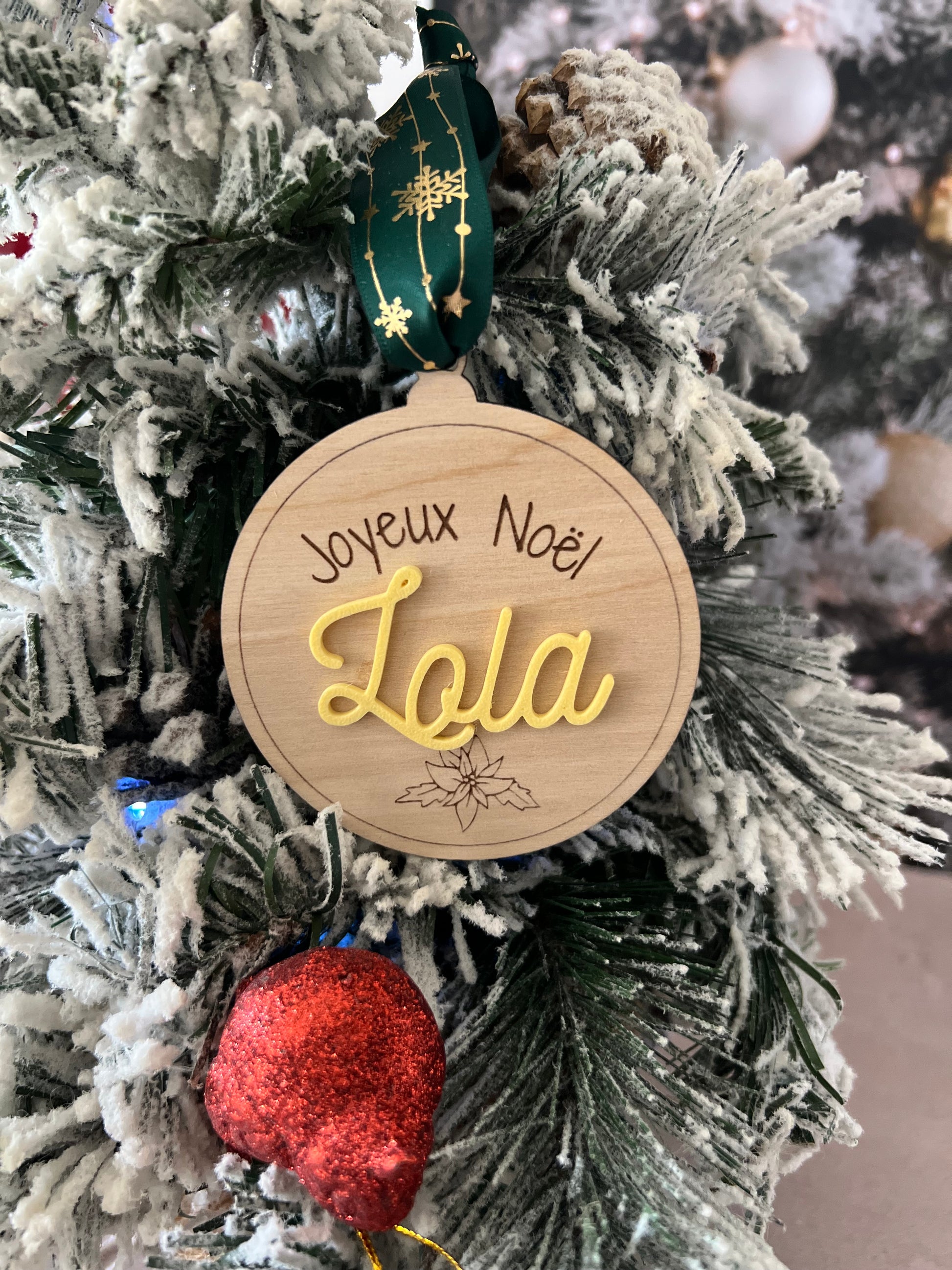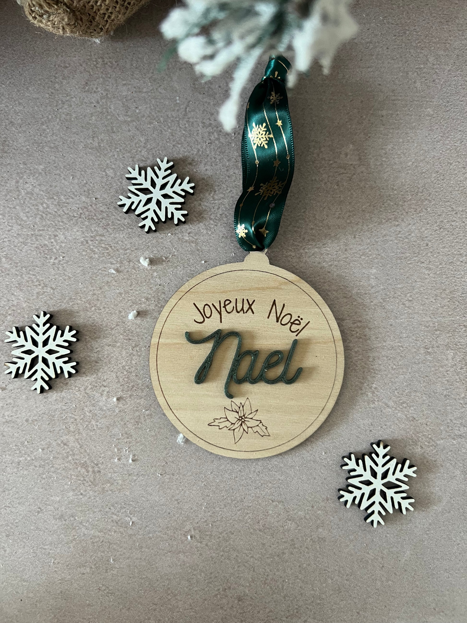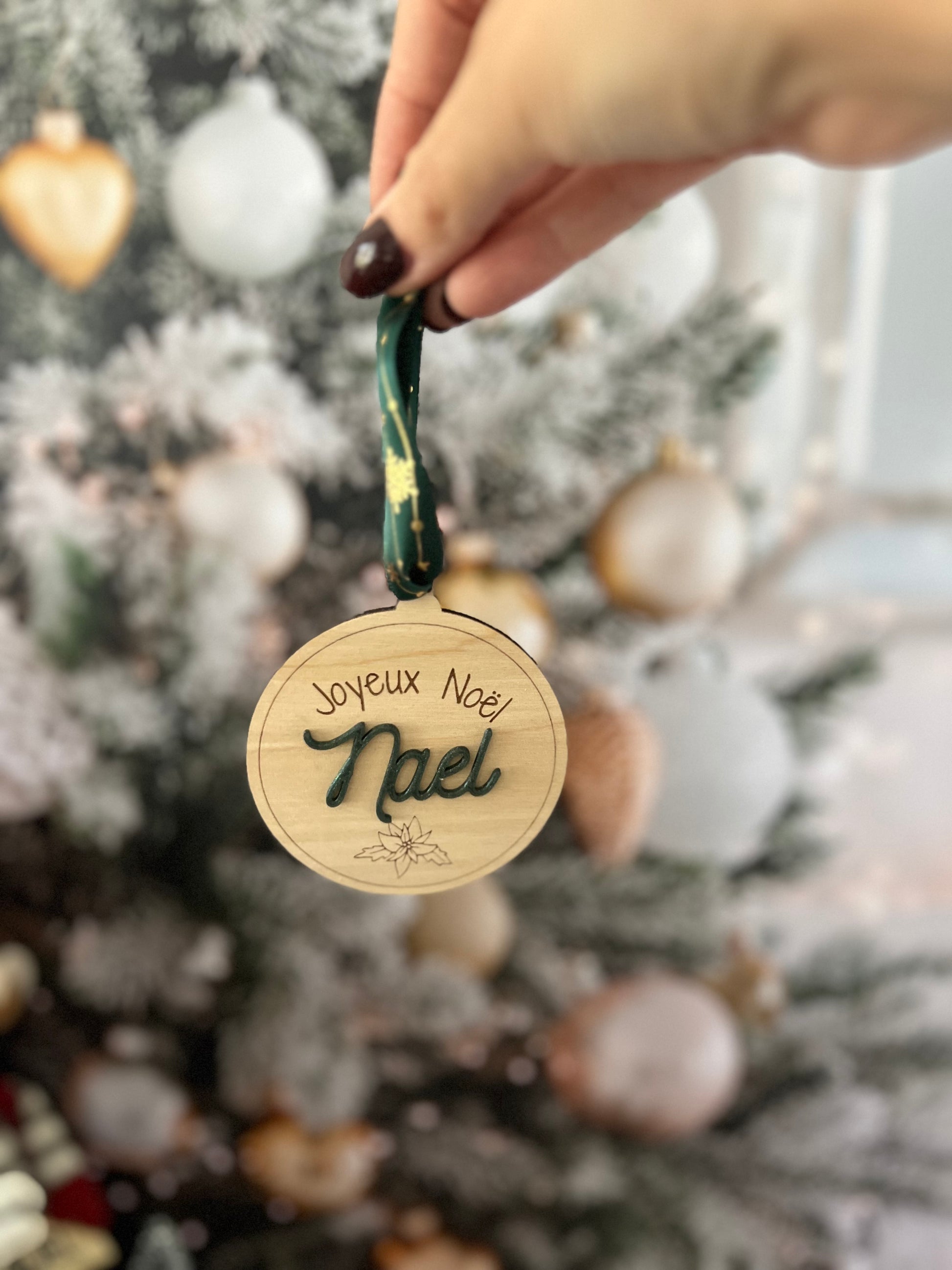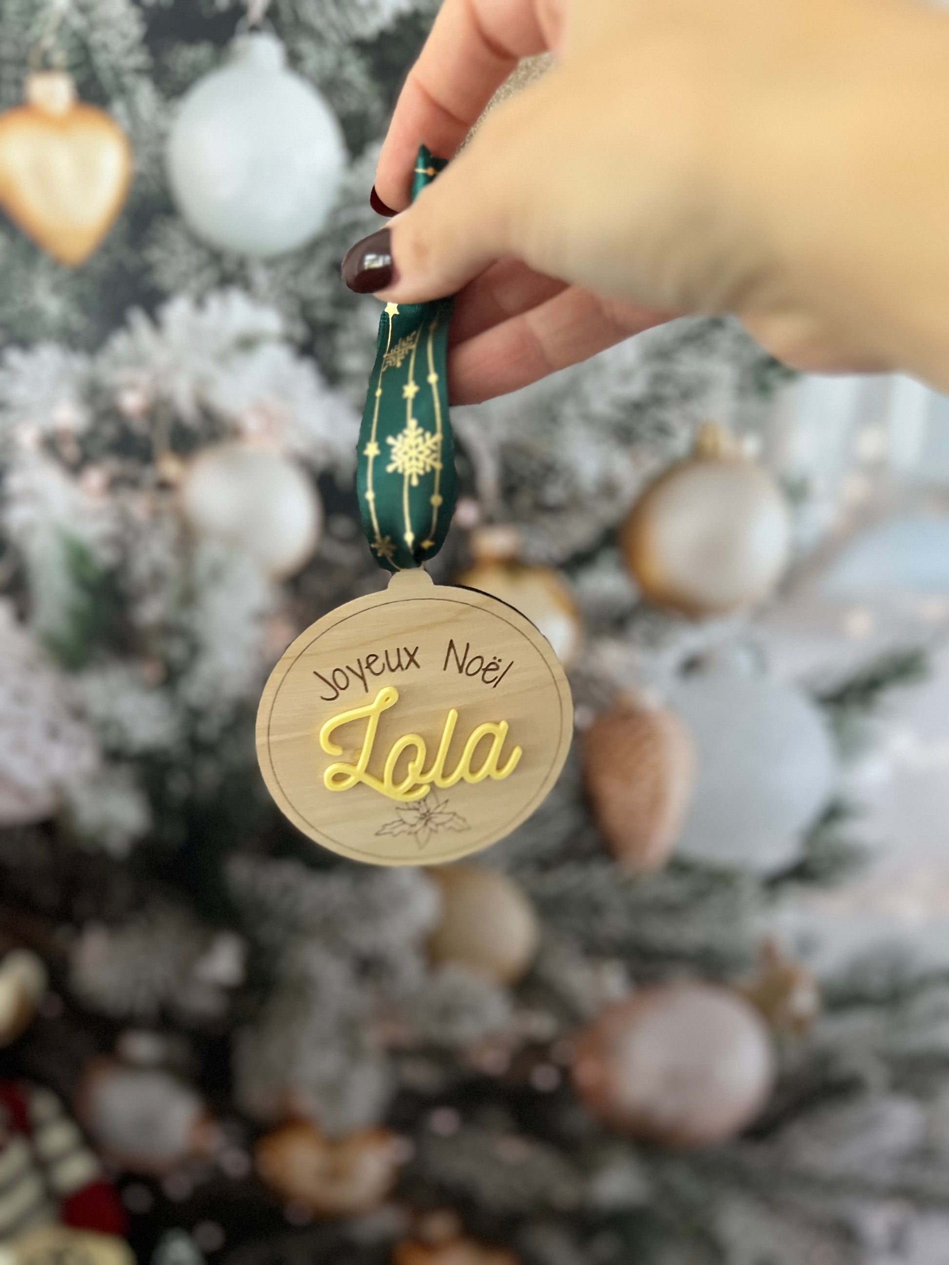 Chaque boule est découpée et gravée avec soin dans du bois de bouleau clair, puis personnalisée avec le prénom de votre choix en couleur pour accompagner vos cadeaux de manière élégante et écoresponsable.