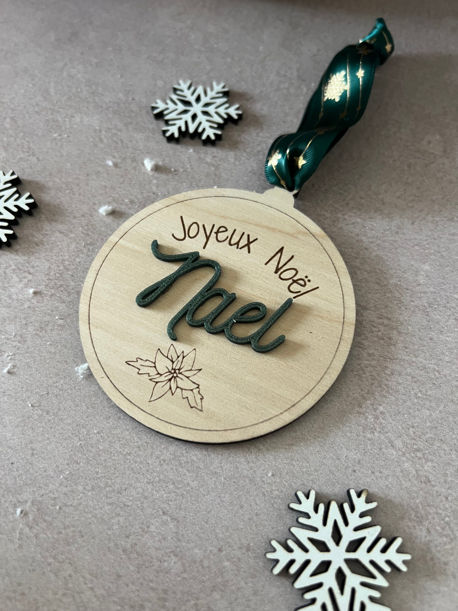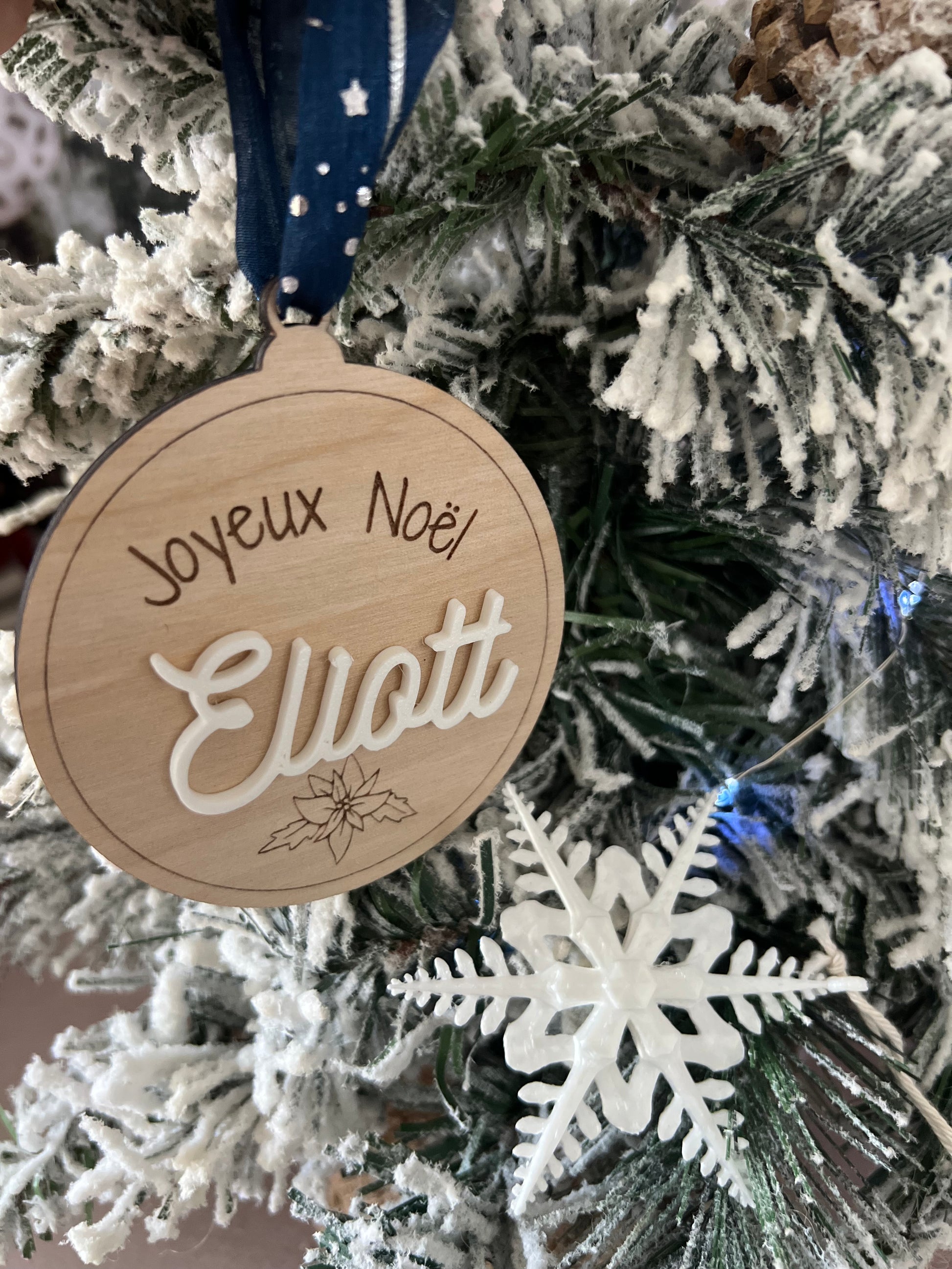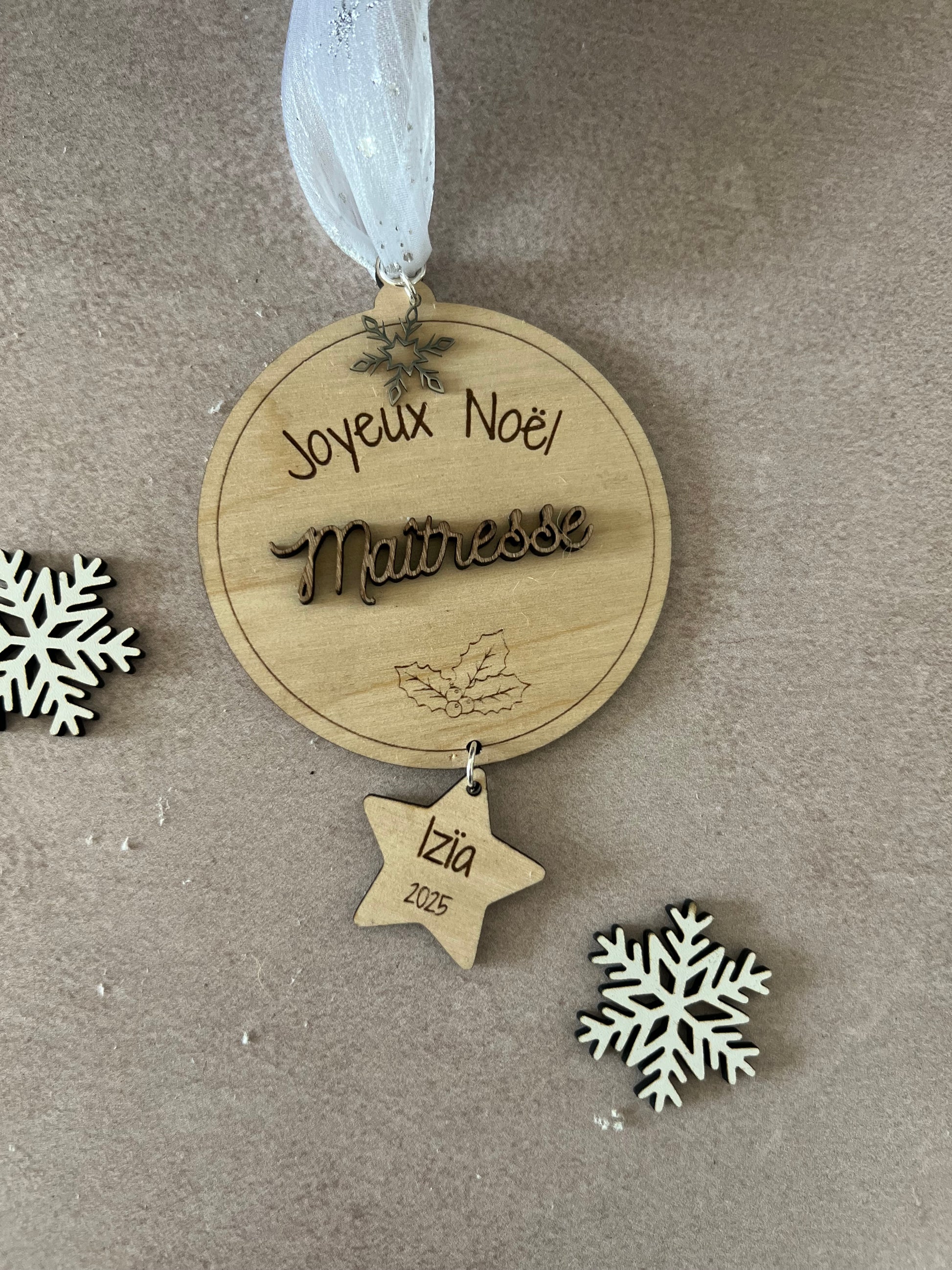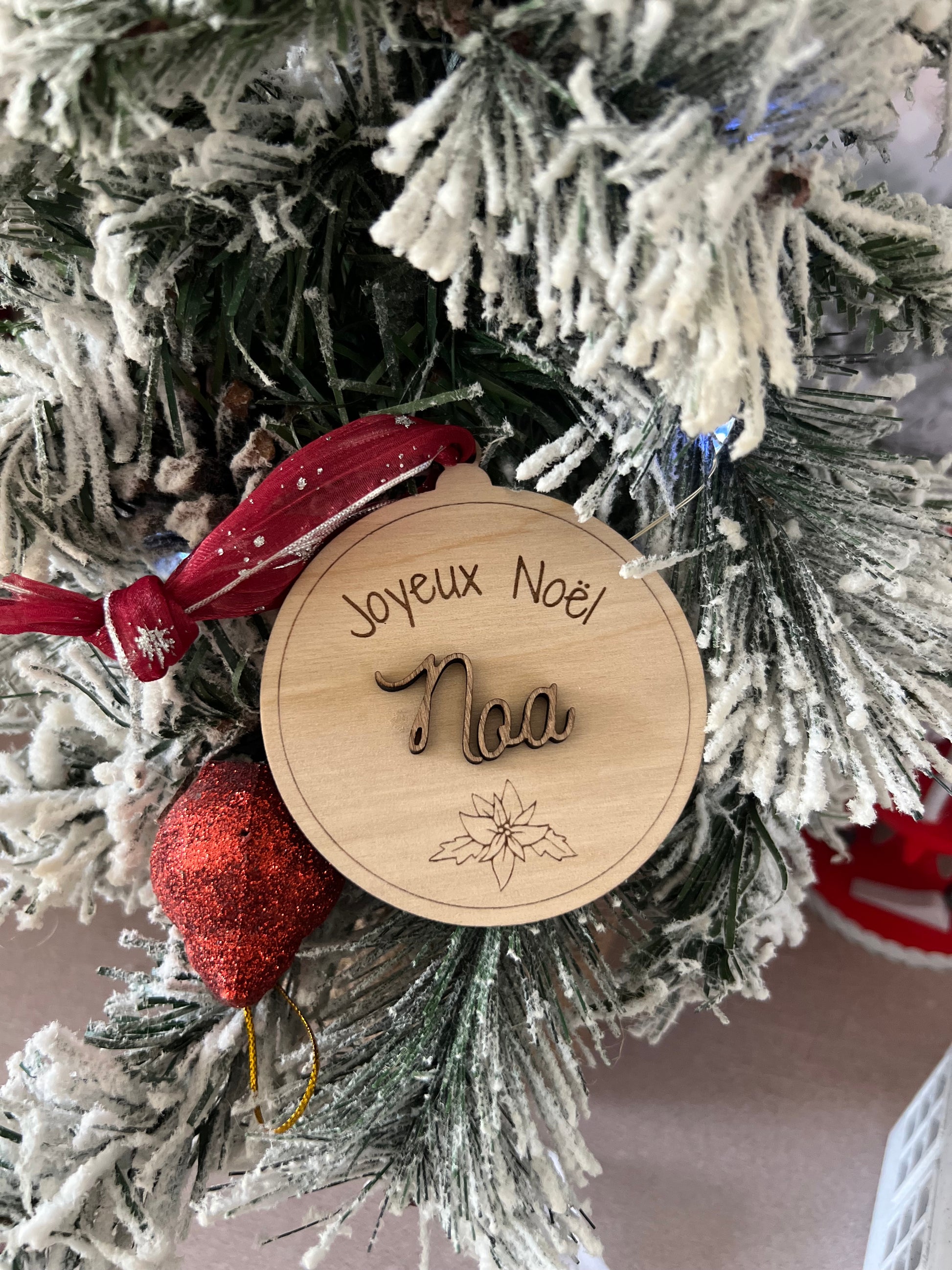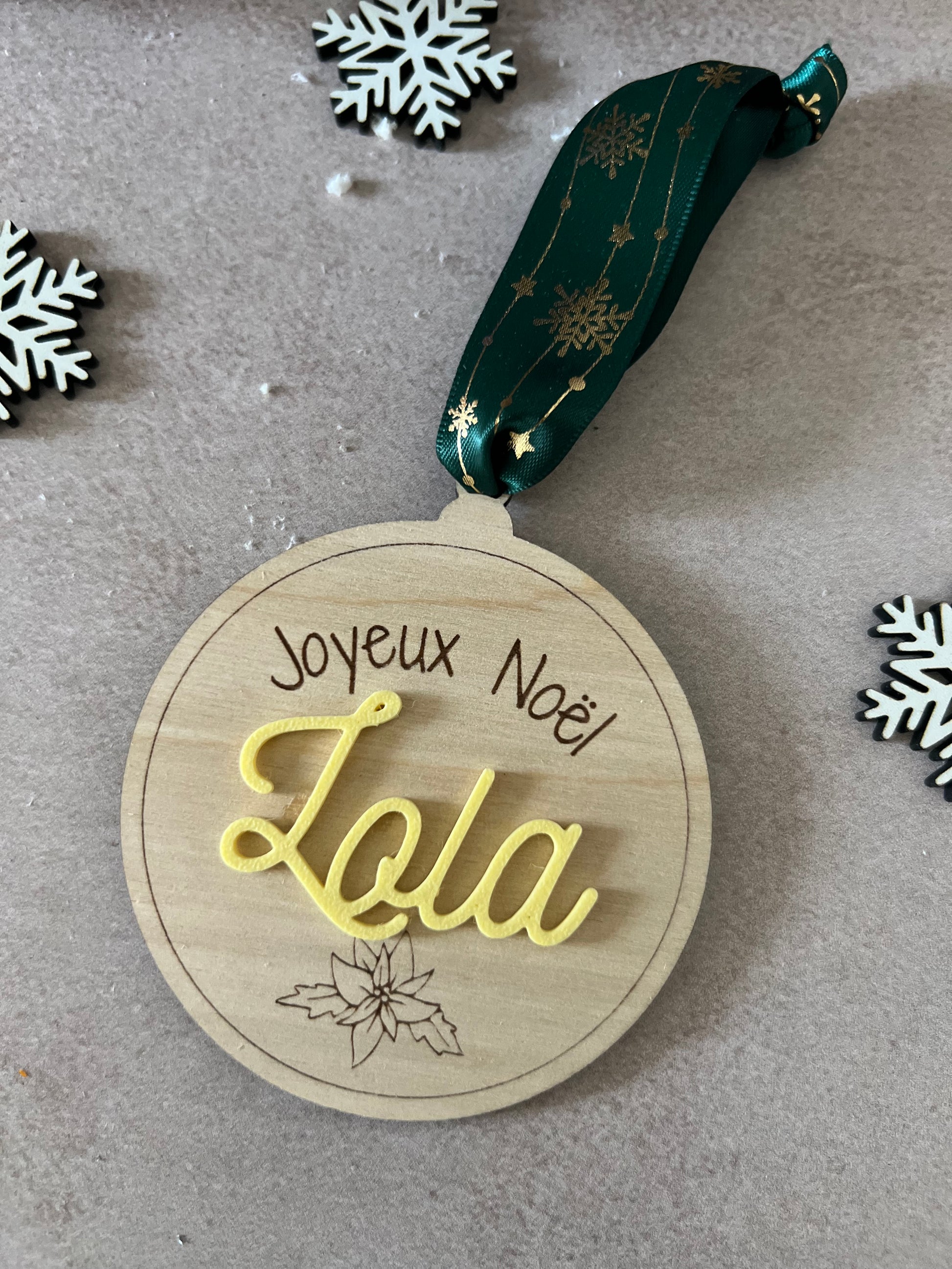 Chaque boule est découpée et gravée avec soin dans du bois de bouleau clair, puis personnalisée avec le prénom de votre choix en couleur pour accompagner vos cadeaux de manière élégante et écoresponsable.