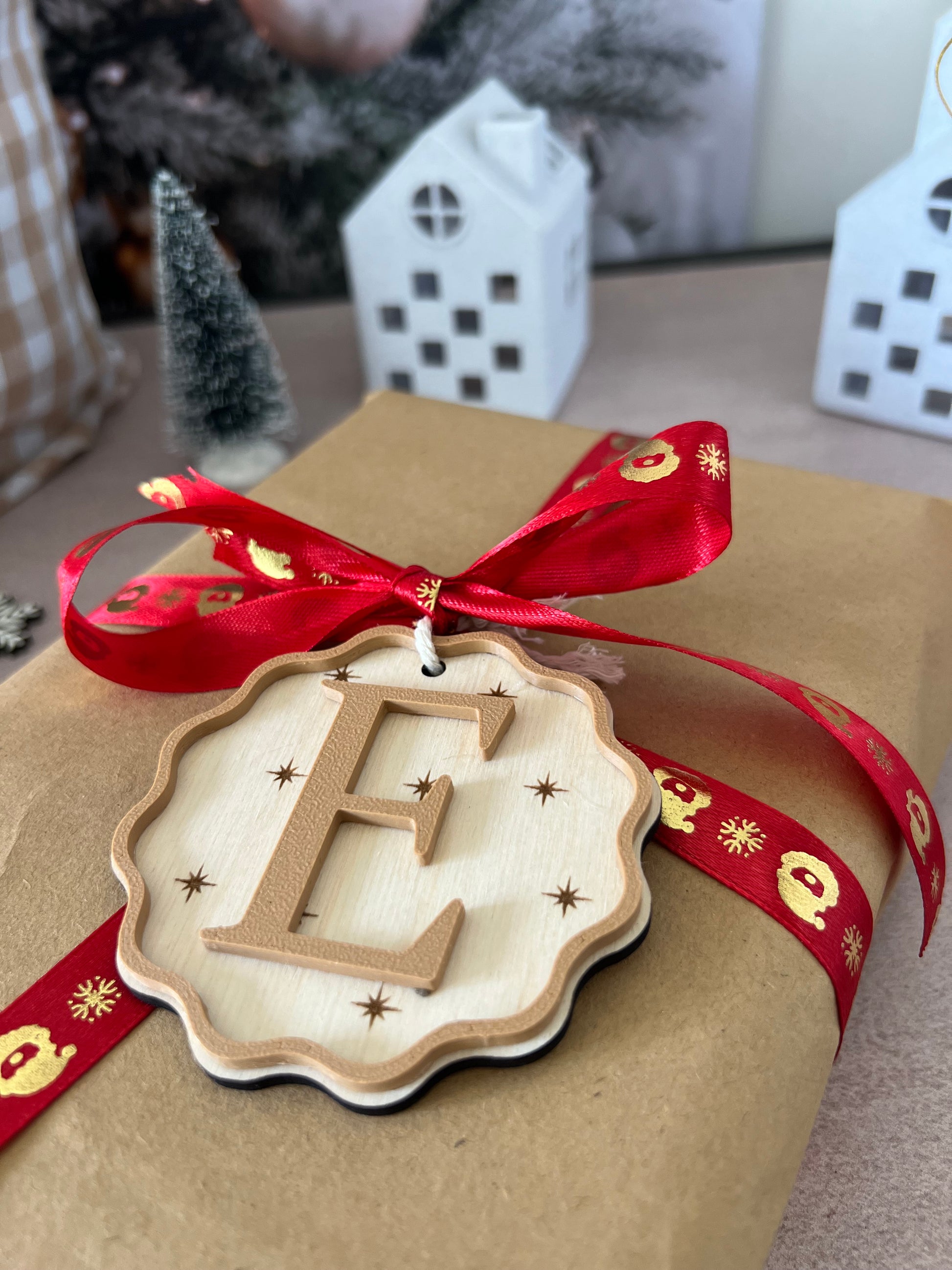 Petite Étiquette cadeau de Noël personnalisée – Bois gravé avec Initiale en couleur